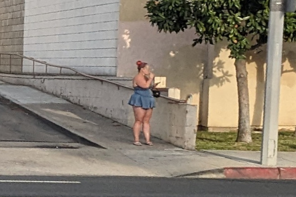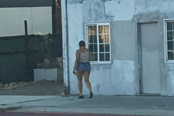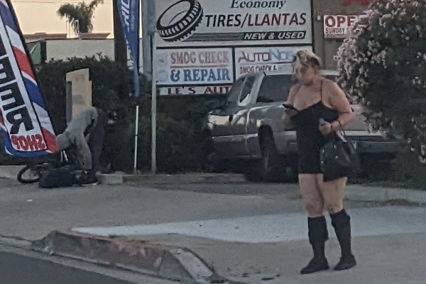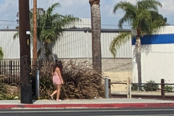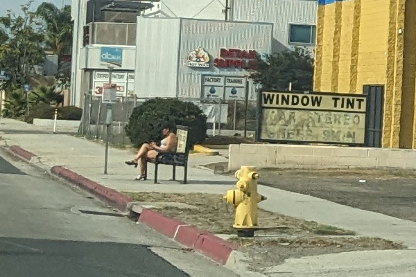 Ah-ha! I noticed the same woman (bus bench girl) a day later walking up and down Beach Blvd. all day long.