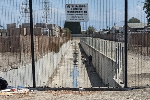 This guy is living around the bend of this flood channel in the area behind the no trespassing sign.