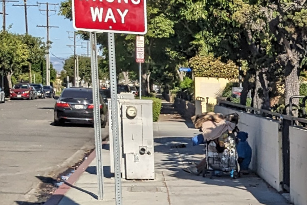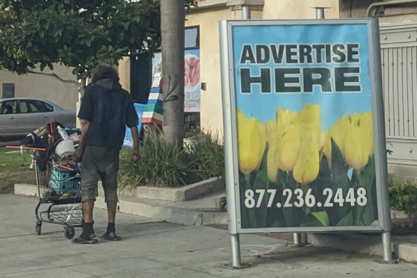 So much to unpack here. Stolen shopping cart. Removed bus shelter due to all the homeless camping there. But, notice the bus shelter advertisement remains even when the shelter has been removed. It's all about the mighty dollar.